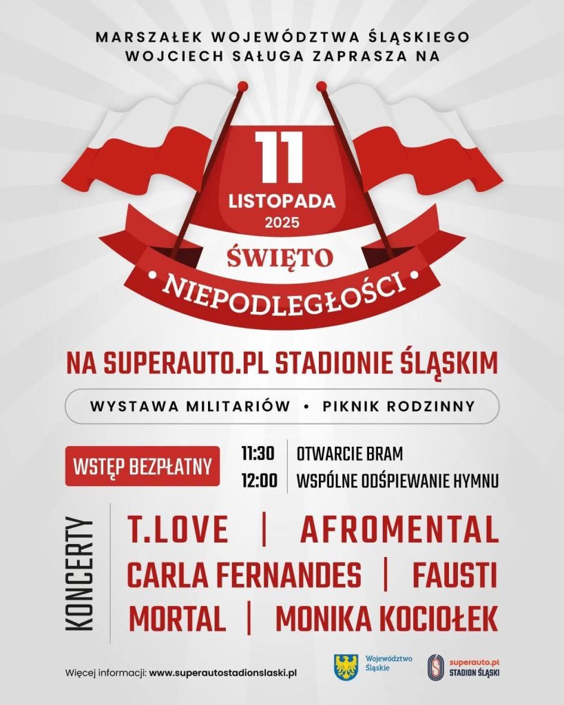 Spędź rodzinne, pełne muzyki Święto Niepodległości na promenadzie Superauto.pl Stadionu Śląskiego! W programie koncerty polskich gwiazd, militaria, pokazy i wiele więcej! Wstęp na wydarzenie jest bezpłatny.